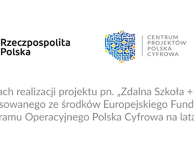 Zakup sprzętu sfinansowany został w ramach realizacji projektu pn. „Zdalna Szkoła + w ramach Ogólnopolskiej Sieci Edukacyjnej” współfinansowanego ze środków Europejskiego Funduszu Rozwoju Regionalnego w ramach Programu Operacyjnego Polska Cyfrowa na lata 2014-2020.