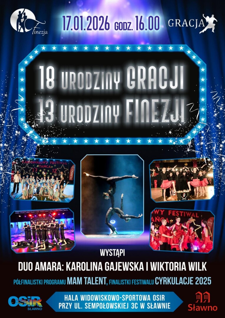 Już 17 stycznia 2026 roku o godzinie 16:00 w Hali Widowiskowo-Sportowej przy SP3 w Sławnie odbędzie się wyjątkowe święto tańca! Zespoły Gracja i Finezja zapraszają na wspólne obchody swoich urodzin.